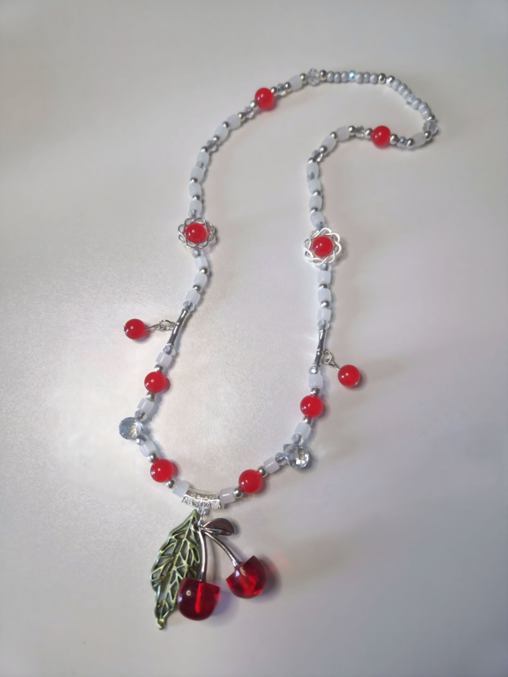 Beaded necklace with red glass beads, glass seed beads silver details with dangly red cherry in silver and leaf.