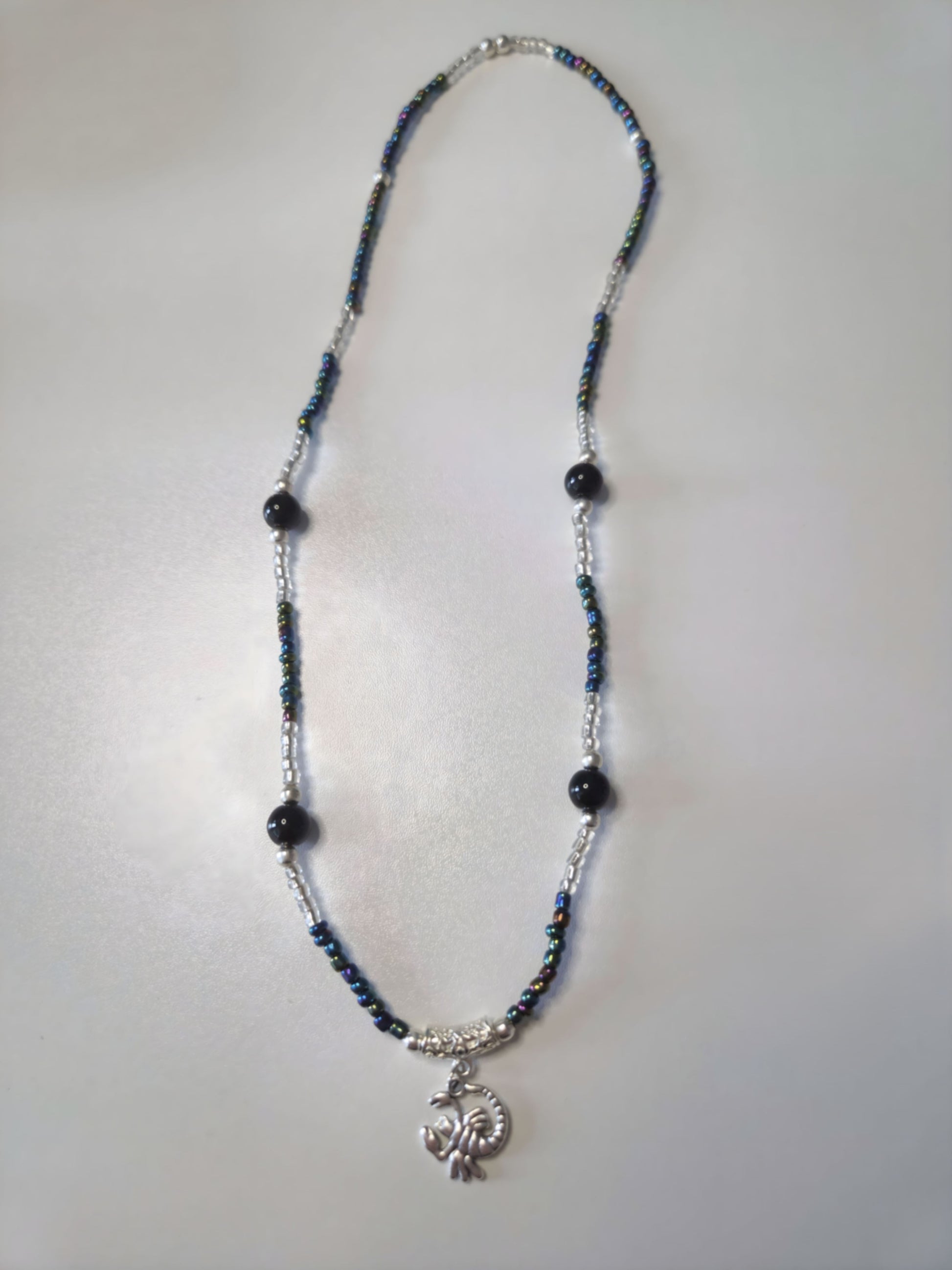 Beaded necklace with black obsidian beads, silver details, glass seed beads and dangly silver scorpion.