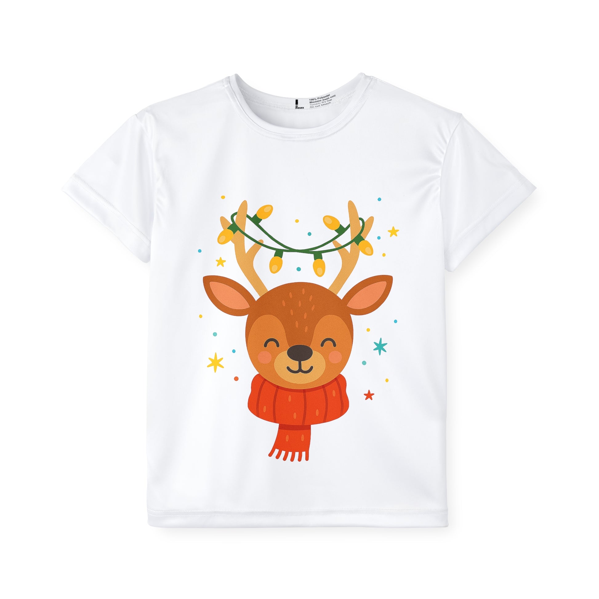 Bright, playful sports jersey designed for kids who love movement and festive fun. Lightweight, moisture-wicking polyester keeps little players cool during practice, recess, or holiday activities. The cheerful reindeer illustration with glowing string lights and a cozy red scarf brings a joyful, seasonal touch that kids will smile at. Stretchy ribbed collar and armholes make dressing easy and keep the fit neat after activity. Crisp, vibrant printing preserves the cute details through washes and playtime. Assembled in the USA with a printed size/care label for comfort and convenience.