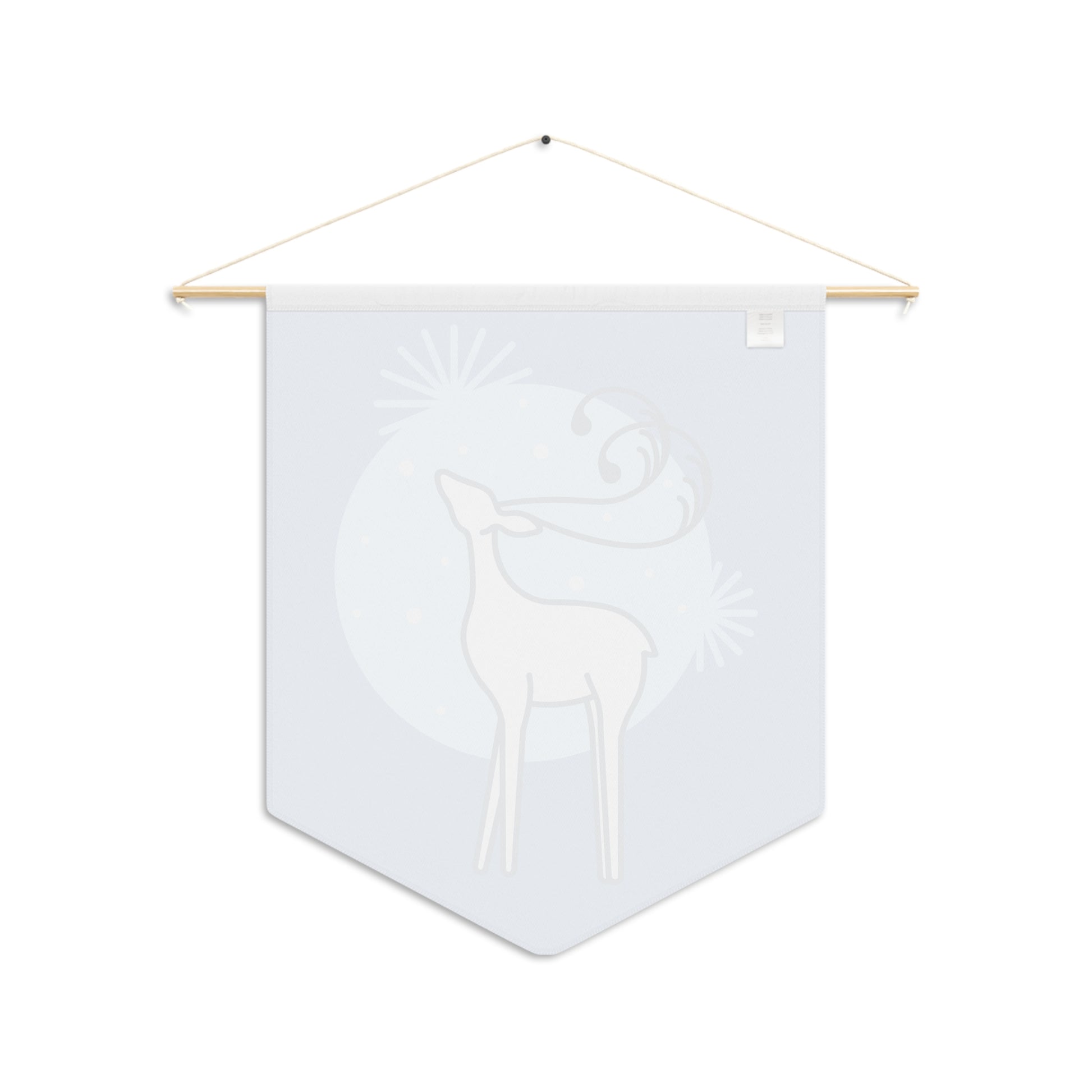 A serene wall pennant that brings quiet winter charm to any room. Soft blue twill holds a graceful stag silhouette beneath a glowing moon and scattered starbursts — a minimalist scene that reads like a breath of cold, clean air. Lightweight and durable, it hangs from a natural wooden dowel with twine for an easy, rustic display. Use it to add a calm focal point to a reading nook, nursery, or entryway; the subtle palette and clean lines blend with cozy cabins, Scandinavian interiors, and modern minimalist spaces.